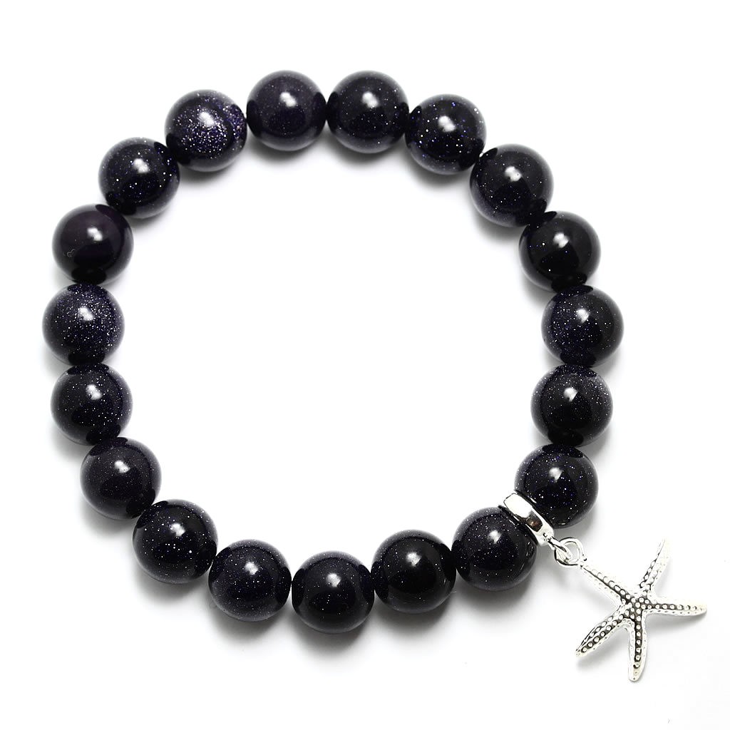 Bransoletka na elastycznej gumce jubilerskiej wykonana z kamienia o nazwie Noc Kairu oraz srebrnej zawieszki w kształcie rozgwiazdy. Noc Kairu to granatowa odmiana szkła awenturynowego z charakterystycznym efektem skrzenia, za który odpowiadają drobinki innych metali, np. opiłki żelaza. Istnieje możliwość zamówienia innego rozmiaru niż podany w opisie.