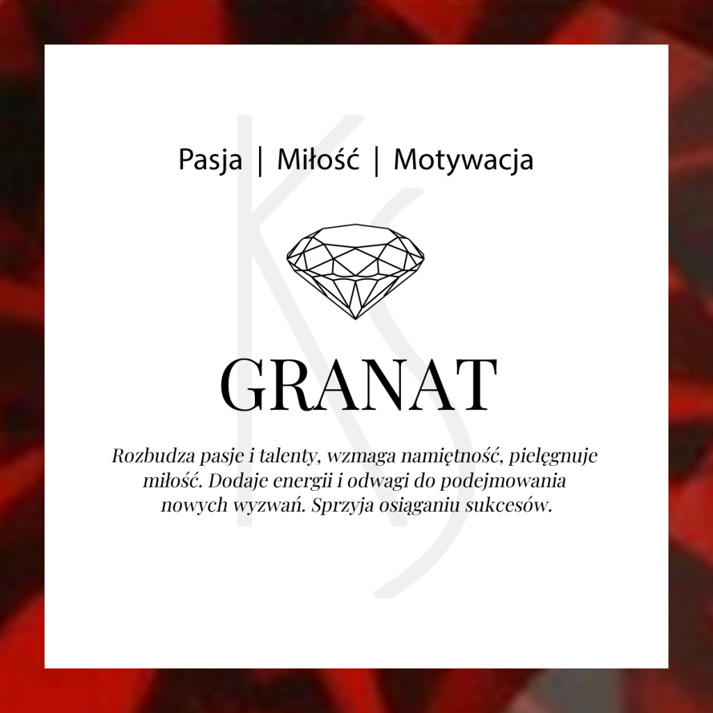 Granat z łacińskiego słowa - granatus (ziarno, granat, owoc granatu) występuje w bardzo szerokiej palecie barw od brunatnej, przez zieloną, żółtą, do bezbarwnej, choć bez wątpienia kolor czerwony i bordowy jest najczęściej spotykanym w przyrodzie. Niezwykle cenną odmianą jubilerską tego kamienia są pozyskiwane w Indiach czarne okazy, które po oszlifowaniu dają efekt kociego oka. Od starożytności przypisywano mu niezwykłą moc i wykorzystywano jako amulet chroniący przed złem, klęską czy ranami podczas wypraw wojennych. Granat to również „kamień romantycznej miłości i pasji”, ponoć rozbudza namiętność i wzmaga energię seksualną. Sprzyja urodzonym spod znaku Barana, Skorpiona, Strzelca, Koziorożca i Wodnika.