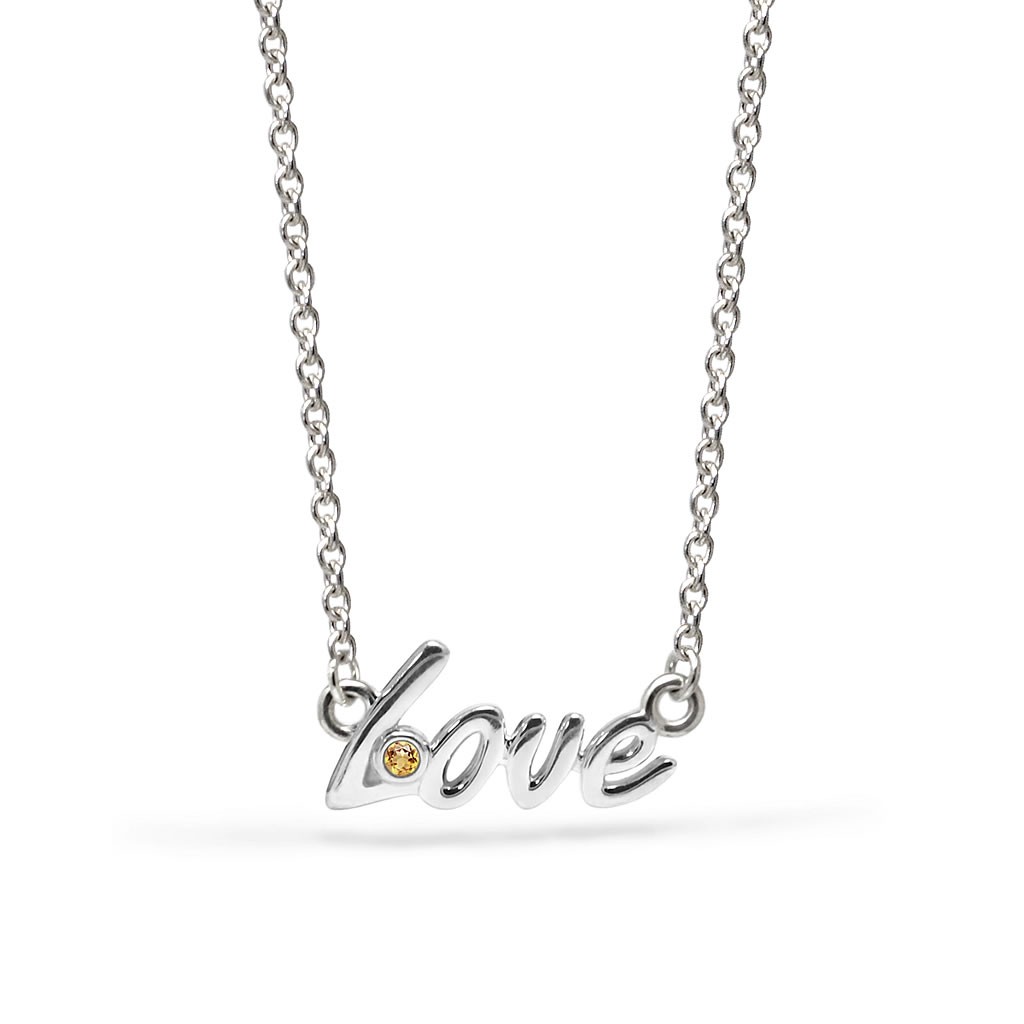 Nowoczesny naszyjnik z napisem "miłość" ręcznie wykonany z najwyższej jakości srebra oraz ozdobiony naturalnym kamieniem w szlifie brylantowym. Regulowana długość naszyjnika pozwala na jego idealne dopasowanie.