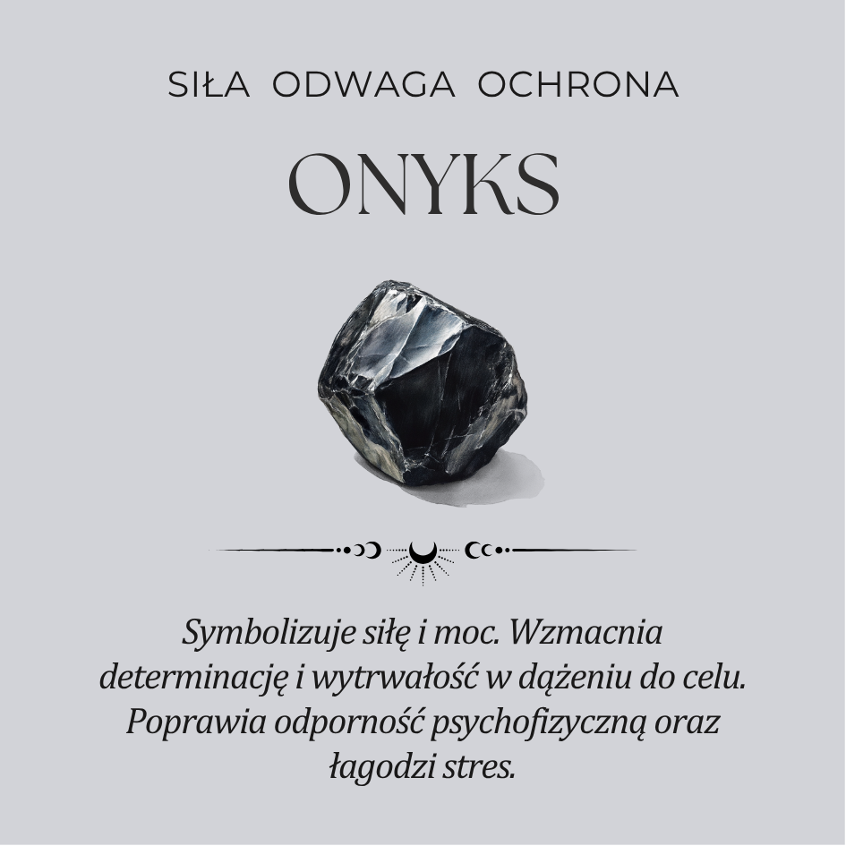 Najczęściej spotykaną wersją tego kamienia jest onyks w ponadczasowej i zawsze eleganckiej czerni, który symbolizuje siłę, odwagę i determinację w dążeniu do celu.
