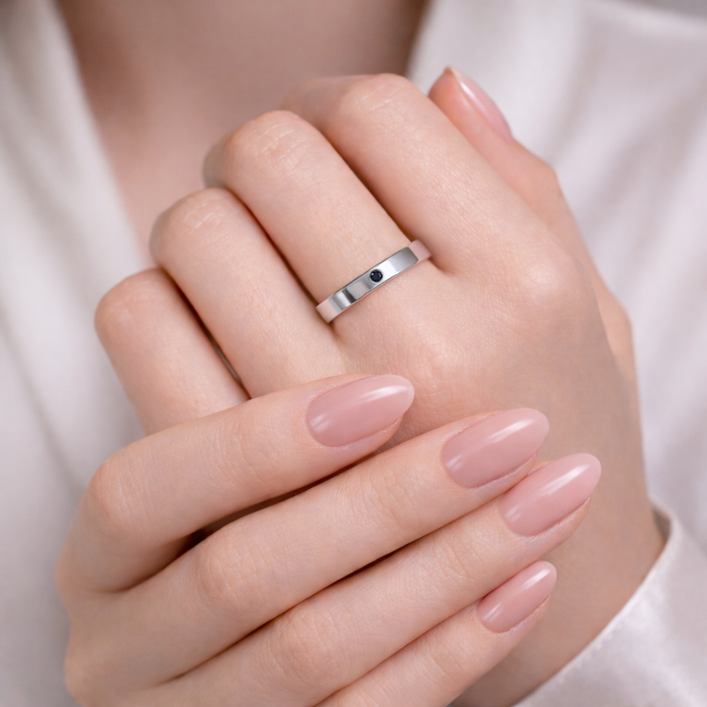 Prosta, minimalistyczna obrączka z subtelnym akcentem w postaci ręcznie osadzonego kamienia naturalnego, który ma symbolizować zmianę, nowe postanowienie, obietnice... Noś ją aby pamiętać o swoich celach, nie zbaczać z wytyczonej drogi i odważnie sięgać po marzenia. Polecana również parom.