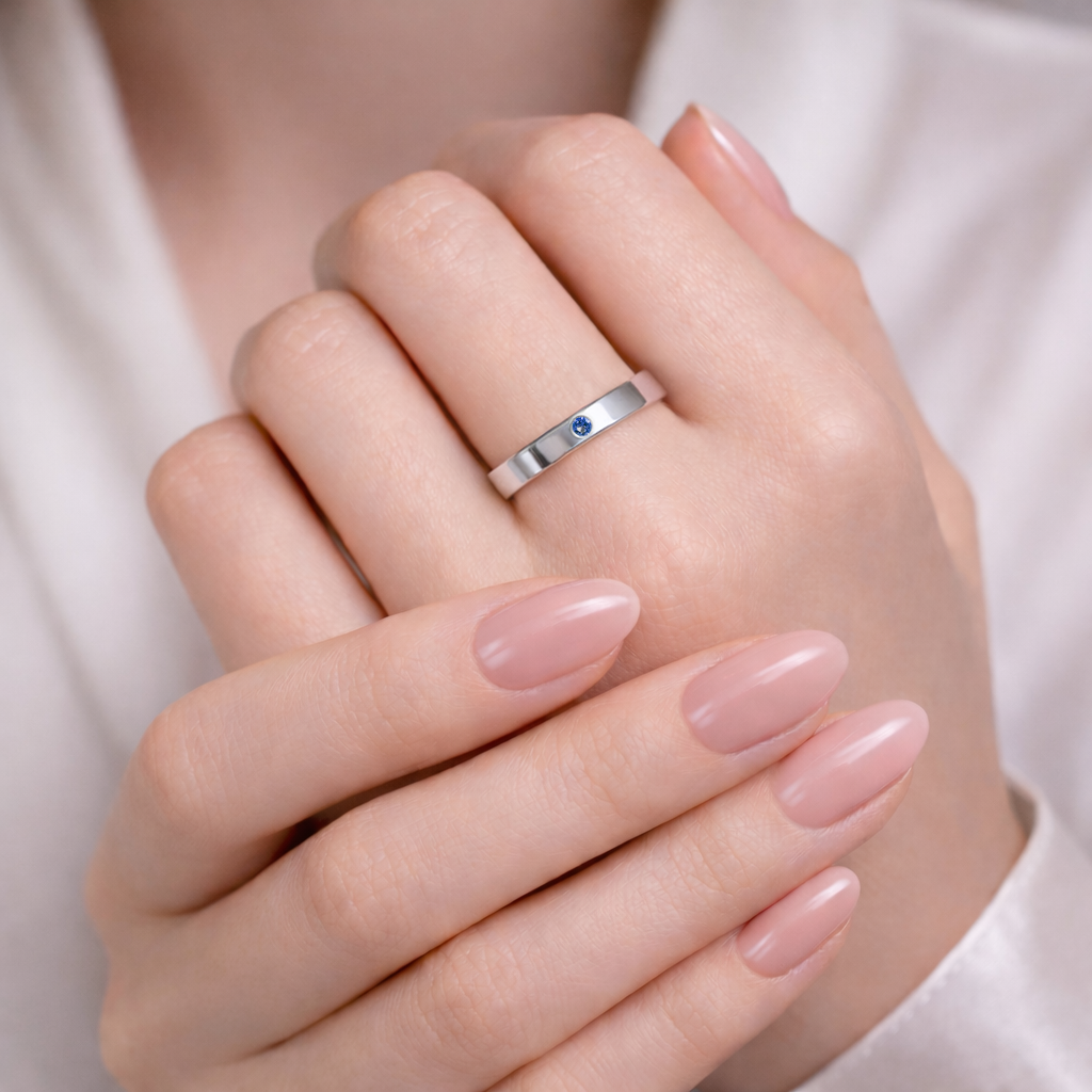Prosta, minimalistyczna obrączka z subtelnym akcentem w postaci ręcznie osadzonego kamienia naturalnego, który ma symbolizować zmianę, nowe postanowienie, obietnice... Noś ją aby pamiętać o swoich celach, nie zbaczać z wytyczonej drogi i odważnie sięgać po marzenia. Polecana również parom.