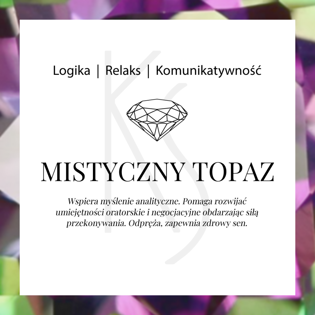 Ten, magiczny, mieniący się kolorami tęczy kamień o nazwie Mistyczny Topaz to bezbarwny topaz powleczony metalem szlachetnym, nadającym mu niepowtarzalną barwę i blask, nie występujące w naturze. Mistyczny topaz jest kamieniem Merkurego – opiekuna rozumu, logiki i twórczości. Ożywia umysł, usprawnia nasze umiejętności oratorskie, oraz wzmacnia siłę przekonywania. Warto zabierać go ze sobą do pracy, gdyż zapewnia również życzliwość przełożonych oraz zdolność przewidywania reakcji innych.